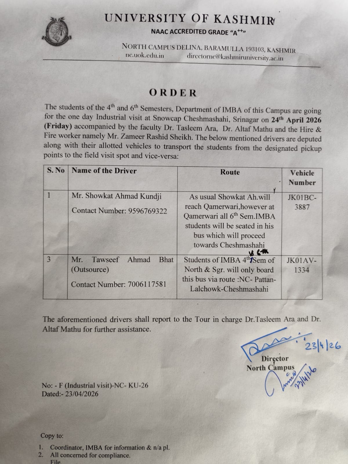 Honble Vice Chancellor Visit to North Campus along with Registrar Kashmir University